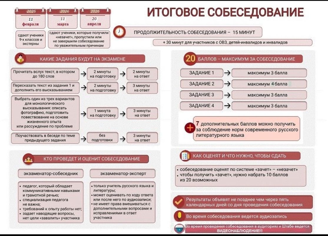 Итоговое собеседование по русскому языку выпускников 9-х классов проводится индивидуально с каждым участником.  Время проведения –