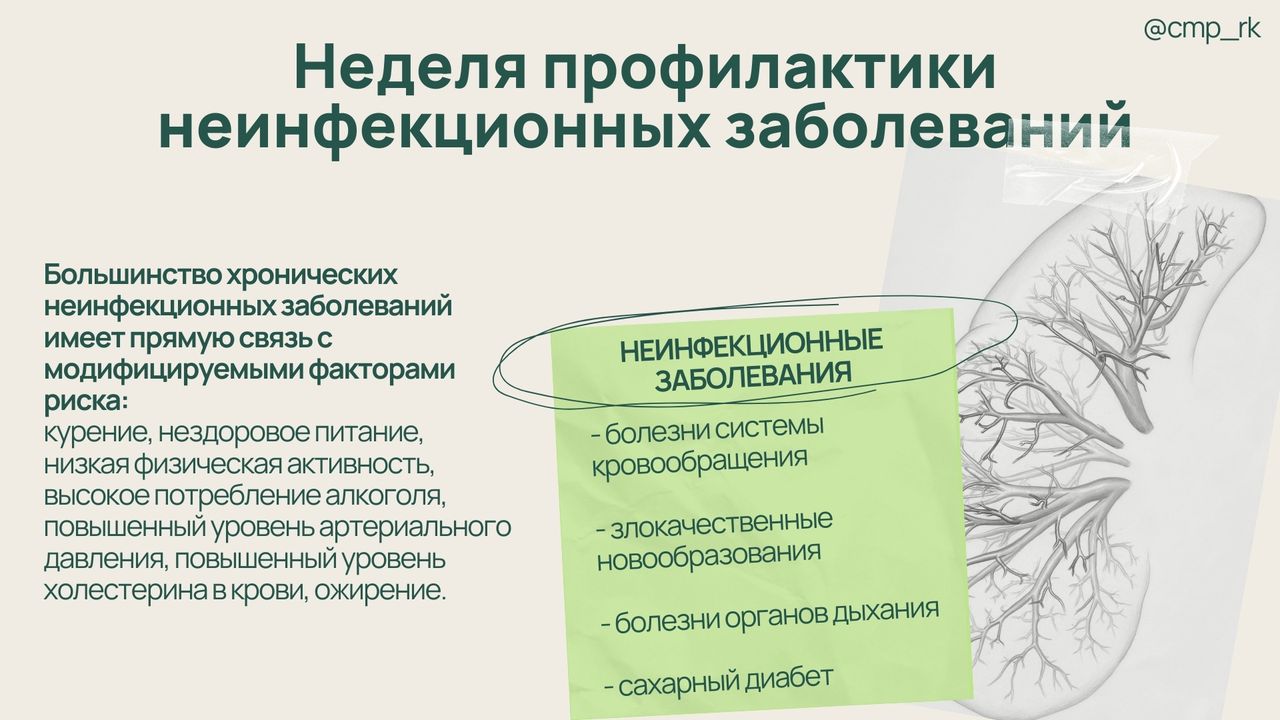 Большинство хронических неинфекционных заболеваний имеет прямую связь с модифицируемыми факторами риска - курение, нездоровое питание, низкая физическая активность, высокое потребление алкоголя, повышенный уровень артериального давления, повышенный уровень холестерина в крови, ожирение.